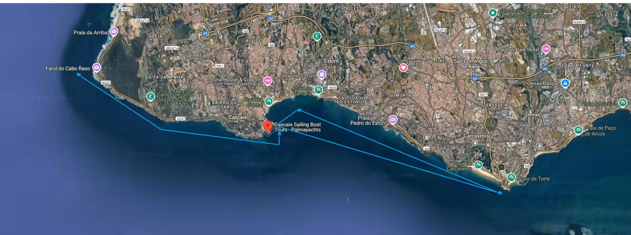 Sailing east along the Riviera, the route passes the elegant Estoril seafront — known for its casino, gardens, and the gentle curve of its shore facing the Atlantic.
